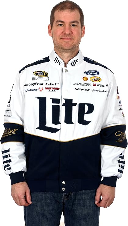 The popular miller lite logo is prominently displayed on a cotton twill shell. Brad keselowski, team penske, ford fusion miller lite, #6: Here is brad keselowski's 2014 primary paint scheme, the miller lite white can ford fusion. Miller lite nascar jacket retro and groovy. This sikk racing jacket has brand logos on the front n' back, and a button up front closure.