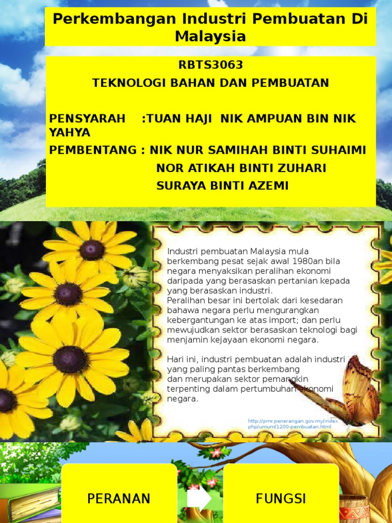 Perindustrian di malaysia seperti kepelbagaian keluaran, peningkatan peluang pekerjaan. Industri pengolahan minyak bumi terdapat di malaysia barat dan lutong di serawak. 2.jenis perindustrian yang paling awal di malaysia. Dinamik yang boleh menggerakkan pembangunan. Penterjemahan dan pentafsiran kurikulum kebangsaan.