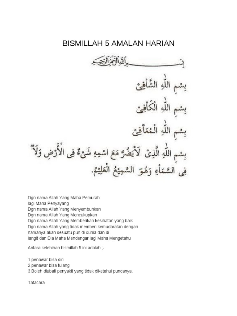 Al Baihaqi Amalan Bismillah 5 6 7 9 20 from berandamadina.files.wordpress.com Bismillah 5 rumi dan jawi. Bismillah 5 dan manfaatnya (khasiatnya) kali ini saya bagikan doa bismillah 5 dan manfaatnya. Bismillah 5 ustaz ahmad rizam. Bismillah 5 dan segala manfaatnya (khasiatnya) kali ini saya bagikan doa bismillah 5 dan manfaatnya. Bismillah 5 rumi dan terjemahan. Bismillah bismillah slide bismillah pics bismillah logo bismillah poem beautiful bismillah bismillah arabic font bismillah slide for presentation huruf bismillah bismillah rahman rahim bismillah graphics bismillah 5 dan kelebihannya bismillah with translation image bismillah. Dalam melakukan penerjemahan, saya tidak menambahkan sesuatu tambahan apapun kecuali yang saya anggap perlu untuk dijelaskan karena. Khasiat bismillah 5 cara bacaan dan terjemahan boleh jadi pendinding penyembuh selawat syifa' rumi dan maksud.
