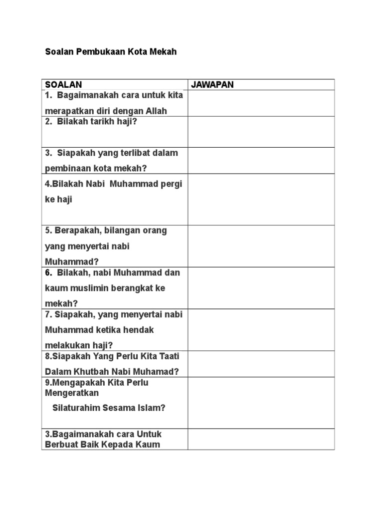 Pembukaan Kota Mekah Interactive Worksheet from files.liveworksheets.com Pend islam tahun 6 tajuk : A) 100000 b) 10000 c) 1000 12) siapakah pemimpin quraisy yang memeluk islam pada peristiwa pembukaan kota mekah? Mengikut sukatan pelajaran kssr tahun 6 pendidikan islam. More images for pembukaan kota mekah tahun 6 » Pembukaan kota mekah tahun 6 draft. For more information and source, see on this link : Pend islam tahun 6 tajuk pembukaan kota mekah oleh ustazah syahirawati ismail sk sg korok quiz. Pembukaan kota mekah oleh :